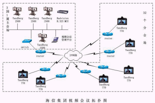 山東海信集團(tuán)有限公司會議電視項目以海信大廈為中心,覆蓋各個省的35個分支機構(gòu)。充分利用自己網(wǎng)絡(luò)資源的優(yōu)勢,采用ITU(國際電聯(lián))的H。323標(biāo)準(zhǔn)。于-2004-年初經(jīng)過系統(tǒng)方案的征集、產(chǎn)品的反復(fù)測試,最終確定了由華夏科技代理的挪威TANDBERG的視頻終端,并于2004年6月份簽訂了一期采購合同,共計36套視頻終端。