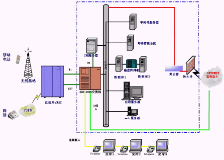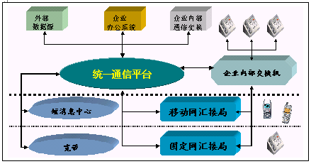 統(tǒng)一通信平臺(tái)提供了與企業(yè)內(nèi)部交換機(jī)(PBX)或PSTN,寬帶或INTERNET和GSM或GPRS網(wǎng)絡(luò)的接口,融合了多種網(wǎng)絡(luò)資源和企業(yè)內(nèi)部數(shù)據(jù)源。為用戶(hù)提供了多種服務(wù)界面:WEB界面、人工服務(wù)界面,IVR界面。同時(shí)為用戶(hù)提供短信息等數(shù)據(jù)業(yè)務(wù)。