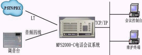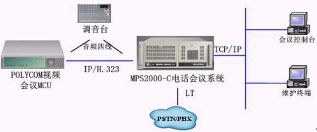 MPS2000音頻橋可以通過IP與視頻會議MCU相連,或者通過音頻四線與調(diào)音臺相連,從而使兩個系統(tǒng)實現(xiàn)語音互連。