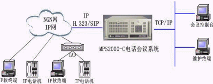 系統(tǒng)提供IP接口與NGN或企業(yè)IP數(shù)據(jù)網(wǎng)相連,用戶可通IP軟件終端、IP電話會議終端、IP電話機參加會議。