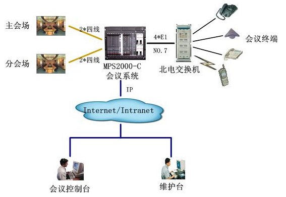 該會(huì)議系統(tǒng)通過(guò)4個(gè)數(shù)字中繼,與北電用戶(hù)交換機(jī)互連,采用PRI信令。與視頻會(huì)議系統(tǒng)主會(huì)場(chǎng)采用四線(xiàn)音頻接口接主會(huì)場(chǎng)調(diào)音臺(tái),保證與視頻會(huì)議系統(tǒng)音頻的無(wú)縫對(duì)接。通過(guò)以太網(wǎng)口與局域網(wǎng)連接,實(shí)現(xiàn)維護(hù)管理及會(huì)議控制等功能。