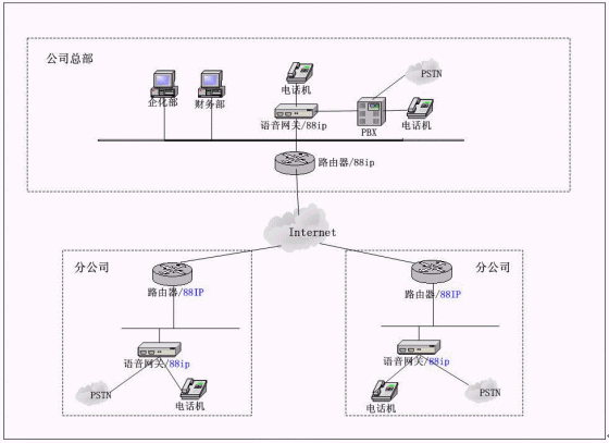 1) 在每個(gè)分公司安裝集成88IP的路由器,再通過路由器做端口映射到VOIP設(shè)備上。