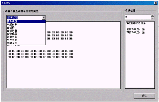通道監(jiān)控:在監(jiān)控欄中顯示0~89個通道,每個通道對應(yīng)一個用戶,當(dāng)用戶撥接入號入會時,用戶自動占用一個通道,用光標(biāo)移至該通道時它自動地打開提示欄,里面顯示該用戶的主叫號碼、級別。