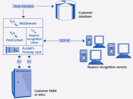 Prosody板卡位于系統(tǒng)的底層,已集成在VeCab系統(tǒng)中。FristContact 媒體服務器與Prosody硬件的通信是通過Aculab的統(tǒng)一API實現(xiàn)的。Prosody不僅用于TTS,而且也用于其它語音處理功能,例如放音、錄音、回音消除和DTMF檢測和生成。此外,VeCab 使用 Aculab的高密度數(shù)字網絡接口模塊來連接ACT的電話系統(tǒng)。