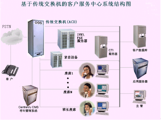 在以往大型CTI系統(tǒng)的設(shè)計中,這種模式是最常用的解決方案。傳統(tǒng)交換機由于其電信級標準的設(shè)計,接入容量大、交換處理能力強、性能穩(wěn)定,因而往往被大、中型呼叫中心用在前端構(gòu)成ACD系統(tǒng)(自動呼叫分配系統(tǒng))用來處理排隊、路由管理、坐席管理等功能。