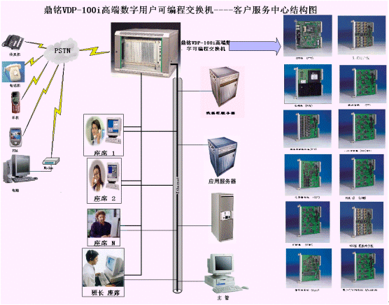 接入平臺實現(xiàn)外界接入的控制和話務交換、資源的合理分配,是構建呼叫中心的成功關鍵所在。DM大型呼叫中心系統(tǒng)接入平臺采用鼎銘VDP-100i高端數(shù)字可編程交換機,該交換機所有資源板卡都采用了高集成度、功能模塊設計思想。該接入平臺的結構如上圖所示的右邊(詳細的功能模塊資源板請參閱《鼎銘高端數(shù)字可編程交換機產(chǎn)品手冊》),用戶可以根據(jù)實際情況靈活配置和增減系統(tǒng)的接入方式、資源類型、資源數(shù)量,達到資源的充分合理利用的目的。