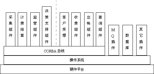 長話計費系統(tǒng)既包括計費結(jié)算系統(tǒng),又包括營業(yè)服務(wù)系統(tǒng),功能比較多,數(shù)據(jù)處理流程也相對復雜。 簡單的傳統(tǒng)數(shù)據(jù)庫的機械化編程已很難滿足系統(tǒng)對大數(shù)據(jù)量的處理及靈活性等方面的要求,因此在這套系統(tǒng)中,我們采用了一些當今業(yè)界的熱門技術(shù)。比如采用了CORBA軟總線思想和MQ Series消息管理隊列,也使之成為聯(lián)機計費系統(tǒng)平臺的一次成功實施。其系統(tǒng)層次結(jié)構(gòu)圖如下: