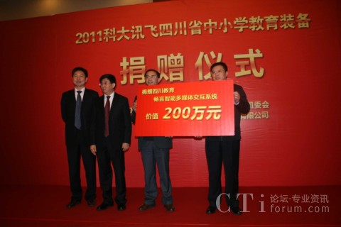 CTI論壇(ctiforum)11月11日消息(記者 潘婷婷): 2011年11月10日,科大訊飛在成都嬌子國(guó)際會(huì)議中心舉行了隆重的捐贈(zèng)儀式,向四川省各市、地州中小學(xué)捐贈(zèng)了價(jià)值200萬(wàn)元的暢言系列教學(xué)產(chǎn)品。會(huì)議由四川省教育廳技術(shù)物資裝備處處長(zhǎng)張生主持,四川省教育廳副廳長(zhǎng)張林祥、科大訊飛副總裁徐玉林在儀式上致辭,來(lái)自各市、地州教育主管部門(mén)領(lǐng)導(dǎo)、各縣區(qū)教育局負(fù)責(zé)人、受贈(zèng)學(xué)校教師代表,以及相關(guān)媒體共100多人等參加了捐贈(zèng)儀式。