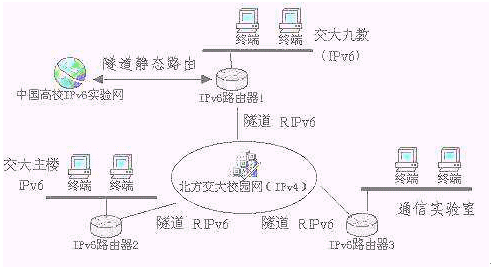 FH6501(IPv6路由器)已經(jīng)在北方交通大學(xué)學(xué)生IPv6實(shí)驗床實(shí)際安全運(yùn)行了六個月。北方交通大學(xué)學(xué)生IPv6實(shí)驗床采用我公司IPv6路由器產(chǎn)品,架構(gòu)了三個主節(jié)點(diǎn),借助隧道連接到由Nokia資助建設(shè)的中國高校IPv6實(shí)驗床。目前三個主節(jié)點(diǎn)之間的連接是借助于學(xué)校原有的IPv4網(wǎng)絡(luò),通過隧道技術(shù)實(shí)現(xiàn)節(jié)點(diǎn)間的通信(見圖示)。