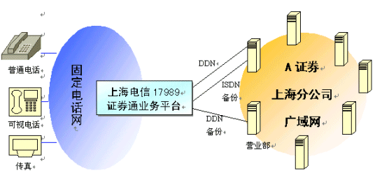 "17989證券通"服務是上海電信和黎明網絡共同向上海地區(qū)證券公司提供的通道外包式綜合服務。與電信提供的傳統(tǒng)的固定通道收費服務不同,"17989證券通"服務的顯著特色是"集中交易,按需服務"。該項服務自推出以來,就以其低成本、集中式電話交易和大量增值服務贏得了許多證券公司的普遍關注。下面是某大型綜合性證券公司采用"17989證券通"服務的案例剖析。