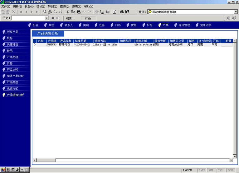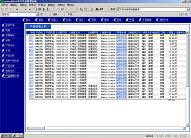 管理人員可能需要對(duì)比產(chǎn)品銷(xiāo)售計(jì)劃與實(shí)際銷(xiāo)售的產(chǎn)品數(shù)量的關(guān)系,也有可能要對(duì)比某款產(chǎn)品與競(jìng)爭(zhēng)產(chǎn)品銷(xiāo)售的情況,這時(shí)候可以利用產(chǎn)品銷(xiāo)售統(tǒng)計(jì)功能。它最大的好處是各項(xiàng)目數(shù)據(jù)普遍關(guān)聯(lián),允許任意組合查詢(xún)條件(見(jiàn)圖4,點(diǎn)擊下圖,可彈出更清晰的大圖)