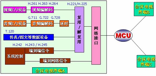 如圖所示:視頻會議終端將輸入進(jìn)來的視頻使用H.261、H.263或H.264協(xié)議、音頻使用G.711、G.722或G.728、數(shù)據(jù)、控制信令進(jìn)行單獨(dú)編碼,然后將編碼后的數(shù)據(jù)進(jìn)行“復(fù)用”打包后形成遵循網(wǎng)絡(luò)協(xié)議的數(shù)據(jù)包,通過網(wǎng)絡(luò)接口傳到MCU供選擇廣播。從MCU傳來的其他會場的數(shù)據(jù)包通過“解復(fù)用”,分別還原成視頻、音頻以及數(shù)據(jù)及控制信令分別相應(yīng)的輸出設(shè)備上回顯或執(zhí)行。