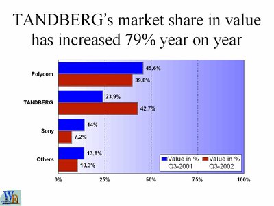 產(chǎn)地挪威,該品牌為視頻會議業(yè)界的高端產(chǎn)品。該品牌全系列均屬第三代產(chǎn)品,具有多項(xiàng)視頻會議的首創(chuàng)技術(shù),最高功耗只有65W,最高帶寬3M,是美國國防部、加拿大國防部、聯(lián)合國教科文組織、歐洲多個(gè)國家王室及大型跨國集團(tuán)選用的品牌,F(xiàn)在全球市場占有量第一位(依據(jù)2002年第3季度資料)。