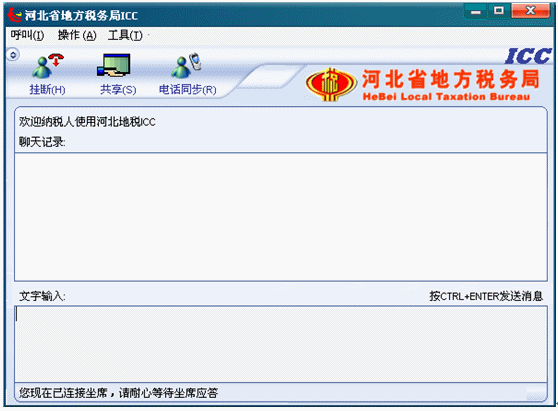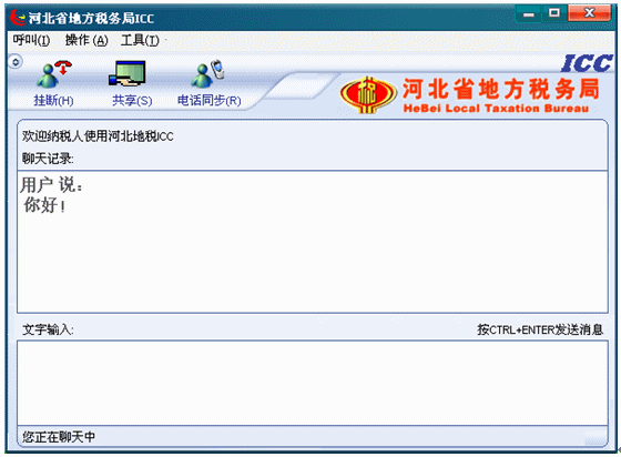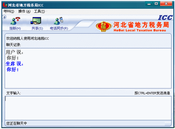 7.等待座席應(yīng)答后,左下角的狀態(tài)欄文字提示首先變?yōu)椤澳F(xiàn)在可以與對(duì)方進(jìn)行文本交談了”,從現(xiàn)在開(kāi)始到納稅人掛斷呼叫期間,納稅人就可以和座席進(jìn)行文本交談了。