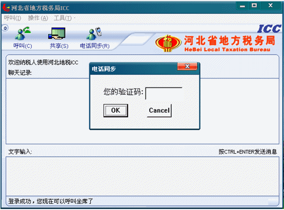 11.電話同步(一種直接呼叫指定座席的功能):如果納稅人先撥打12366,正在和河北省地市的某一座席通電話。此時(shí),納稅人需要此座席向納稅人提供ICC的幫助(文本交談和遠(yuǎn)程共享),納稅人就不能直接點(diǎn)擊呼叫按鈕,因?yàn)榧{稅人點(diǎn)擊呼叫按鈕系統(tǒng)將把納稅人的呼叫轉(zhuǎn)向納稅人呼叫地市的任意空閑座席,可能納稅人的呼叫就不能被轉(zhuǎn)到此時(shí)和納稅人通話的座席。準(zhǔn)備電話功能就能幫助納稅人直接呼叫到和納稅人通電話的座席。具體做法如下:通過(guò)電話,向和納稅人通電話的座席要一個(gè)驗(yàn)證碼,讓后點(diǎn)擊準(zhǔn)備電話按鈕,此時(shí)將出現(xiàn)一個(gè)“電話同步”的對(duì)話框,如下圖: