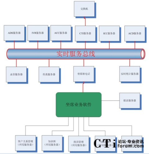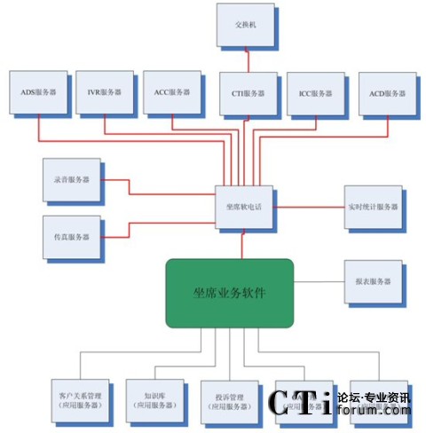 很多集成商或業(yè)務(wù)軟件開(kāi)發(fā)商認(rèn)為這種結(jié)構(gòu)過(guò)于復(fù)雜,而他們自身往往提供“整體解決方案”,即所有的服務(wù)器軟件基本上都是自己的,根據(jù)客戶(hù)的要求修改即可。例如,客戶(hù)關(guān)系管理、知識(shí)庫(kù)、投訴管理、OA、訂單管理以及坐席軟電話、ADS服務(wù)器、IVR服務(wù)器、ACC服務(wù)器、ICC服務(wù)器、ACD服務(wù)器、錄音服務(wù)器、傳真服務(wù)器、報(bào)表服務(wù)器、實(shí)時(shí)統(tǒng)計(jì)服務(wù)器都是自己來(lái)做,那么對(duì)于很多接口環(huán)節(jié)都可以節(jié)省了。