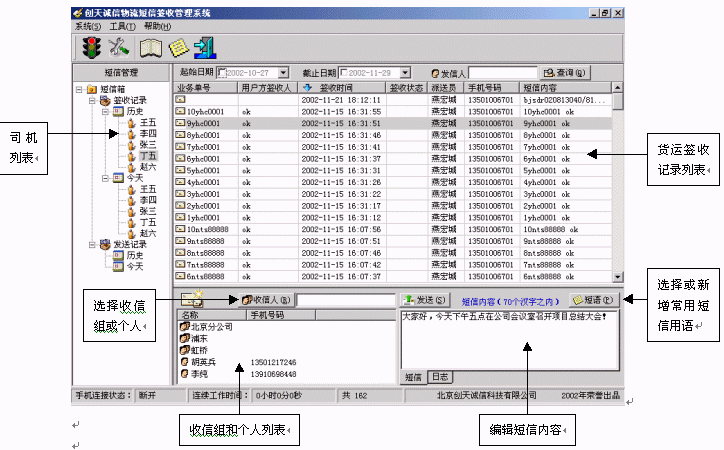 支持分組定義,使用本系統(tǒng)發(fā)送短信,可選擇發(fā)送對(duì)象為幾個(gè)組,也可以是幾個(gè)人這一功能還可用于企業(yè)對(duì)內(nèi)發(fā)布通知以及對(duì)外進(jìn)行廣告宣傳。