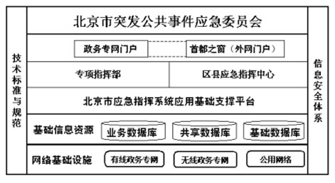 根據(jù)北京市《應急指揮系統(tǒng)信息化技術支撐體系》,北京市的應急系統(tǒng)能夠體系結構細化為下圖: