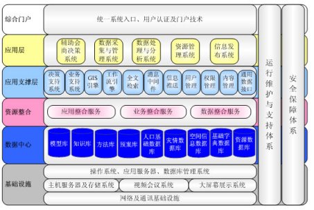 整個系統(tǒng)的底層是信息系統(tǒng)的基礎設施,這包括網(wǎng)絡及通訊設施、主機服務器及存儲系統(tǒng)、視頻會議系統(tǒng)、大屏幕數(shù)據(jù)演示系統(tǒng),以及操作系統(tǒng)、數(shù)據(jù)庫管理系統(tǒng)及網(wǎng)絡通訊基礎設施等,這些是系統(tǒng)最基本的運行基礎。