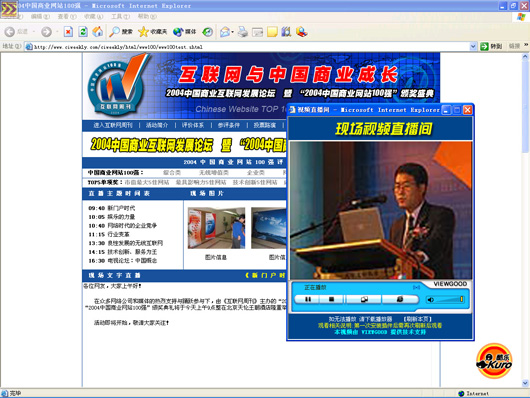 作為此次活動(dòng)全程流媒體直播技術(shù)提供商VIEWGOOD(www.viewgood.com)商務(wù)主管在活動(dòng)現(xiàn)場(chǎng)說:“中國(guó)大陸的上網(wǎng)用戶總?cè)藬?shù)即將突破1億,中外商業(yè)網(wǎng)站的資本運(yùn)作空前活躍,3G、IPv6等新技術(shù)將催生互聯(lián)網(wǎng)的新一輪變革,網(wǎng)絡(luò)媒體正在從“第四媒體”快速走向“第一媒體”,致力為中國(guó)互聯(lián)網(wǎng)媒體服務(wù)的VIEWGOOD和所有的網(wǎng)站一樣,既面臨著激烈的挑戰(zhàn),更面臨著難得的發(fā)展機(jī)遇。無論是成長(zhǎng)最快的網(wǎng)站、最具潛力的網(wǎng)站,還是創(chuàng)新最佳的網(wǎng)站,都是VIEWGOOD的合作伙伴。我們將以國(guó)際最先進(jìn)的流媒體技術(shù)服務(wù)于中國(guó)互聯(lián)網(wǎng)!