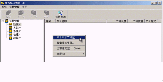 如果你要添加大量的節(jié)目,就需要用到"批量添加節(jié)目"這個功能了。批量添加又分為按目錄、按文件和添加連續(xù)劇3種。按目錄方式就是把一個文件夾里的所有流媒體文件全部加進(jìn)去;按文件方式就是手動選擇多個文件添加;添加連續(xù)劇和按文件差不多,不同的是添加的多個文件共用一個連續(xù)劇名稱在網(wǎng)頁里出現(xiàn),你要點了連續(xù)劇的名稱進(jìn)入后再點想看的集數(shù)來觀看。