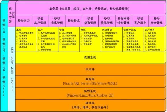 億美B2M移動(dòng)商務(wù)解決方案是由一系列全面支持移動(dòng)通信技術(shù)、自動(dòng)識(shí)別技術(shù)以及移動(dòng)信息終端的應(yīng)用系統(tǒng)組成的企業(yè)移動(dòng)應(yīng)用管理平臺(tái)。這些應(yīng)用系統(tǒng)包括移動(dòng)辦公、移動(dòng)生產(chǎn)管理、移動(dòng)倉(cāng)庫(kù)管理、移動(dòng)物流、移動(dòng)銷售管理、移動(dòng)渠道管理、移動(dòng)市場(chǎng)促銷和移動(dòng)客戶服務(wù)等基于移動(dòng)商務(wù)技術(shù)的企業(yè)應(yīng)用。從業(yè)務(wù)流程上看,涵蓋企業(yè)的采購(gòu)、生產(chǎn)、倉(cāng)儲(chǔ)、物流、市場(chǎng)營(yíng)銷、銷售和渠道、客戶服務(wù)等企業(yè)生產(chǎn)和經(jīng)營(yíng)過(guò)程。