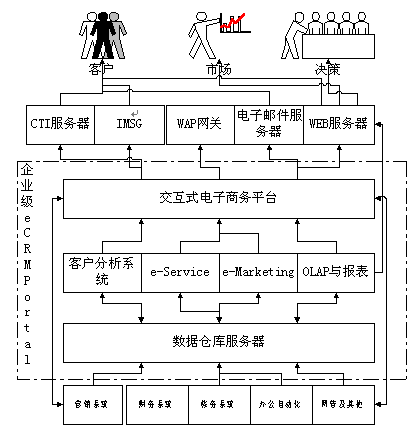 交互式電子商務(wù)平臺(tái):負(fù)責(zé)將企業(yè)內(nèi)部的系統(tǒng)和企業(yè)的電子渠道(如:WEB、電子郵件、WAP、手機(jī)短消息和呼叫中心(Call Center)等)與企業(yè)內(nèi)部的業(yè)務(wù)系統(tǒng)(如:銷售系統(tǒng)、ERP系統(tǒng))等連接起來(lái)共同為客戶提供更為有效的服務(wù)。