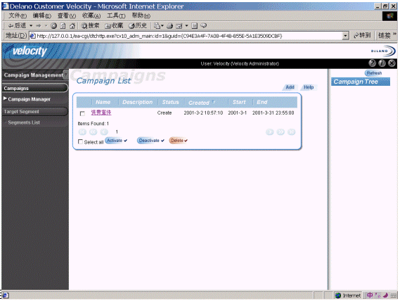 易虹德龍(Delano),所提供的Custoemr Velocity滿足了CRM用戶在電子營銷方面的需求。在這個平臺上,CRM系統(tǒng)用戶,可以通過WEB界面,輕松地針對客戶分組制定和管理所有市場活動。這些市場活動,通過多個步驟一步一步地抓住客戶的“心”。下圖是使用易虹解決方案進(jìn)行活動管理的界面: