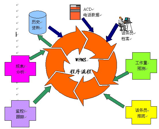如上面所描述的WFMS流程,最初開始于歷史的電話信息、目前的ACD數據和服務代表的簡介。從這些綜合的信息,做出對工作量的預測,從而從本質上決定了配備給呼叫中心的服務代表數量。了解了服務代表的需求數量,一個適用于任何時間段的工作時間表就可以產生了,包括每天的,每周的,每月的。基于這一點,主管人就可以監(jiān)控服務代表的行為,追蹤來電,并分析不同種類的來電分組,做出應對假定情景的方案,從而產生各種各樣的報告和圖表。
