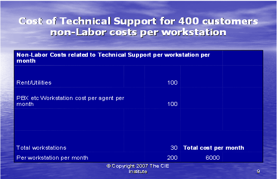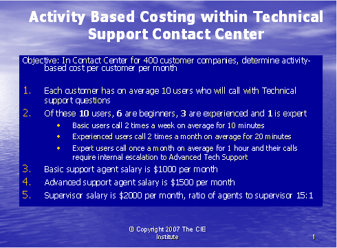 我們將舉例說明我們?nèi)绾螢橐粋(gè)呼叫中心使用行動(dòng)成本法,以確定服務(wù)一個(gè)客戶所花費(fèi)的成本。我們將在一個(gè)技術(shù)支持呼叫中心中舉例。在這樣一種呼叫中心中,座席員為帶著問題呼入的客戶提供技術(shù)協(xié)助。查明服務(wù)一個(gè)客戶所花費(fèi)的成本的一個(gè)主要的原因是懂得如何為技術(shù)支持定價(jià),以至于我們知道如何為了贏利去收費(fèi)。如果我們精確地了解對(duì)每個(gè)客戶上所花費(fèi)的成本,我們的定價(jià)策略就不用再依賴于猜測(cè)工作。