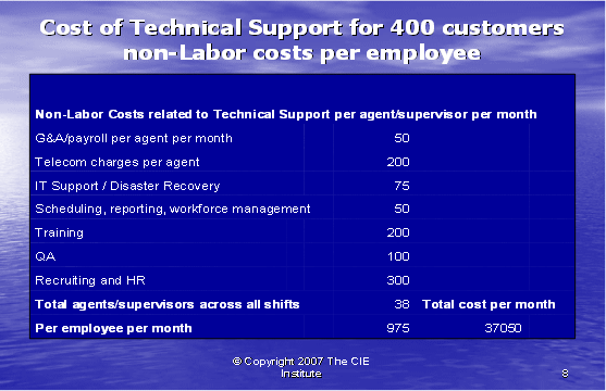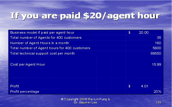 根據(jù)圖表12,我們可以算出第二種方式的利潤(rùn)百分比。如果我們假設(shè)每個(gè)客戶每年的收入是20,000美元,其中分配給呼叫中心部門的收入是20%。我們每個(gè)客戶每月的收入是333.33美元,每個(gè)客戶月的成本是223.88美元(參見圖表10)。這導(dǎo)致我們來自每個(gè)客戶每月的利潤(rùn)是109.46美元——這將產(chǎn)生33%的利潤(rùn)率。