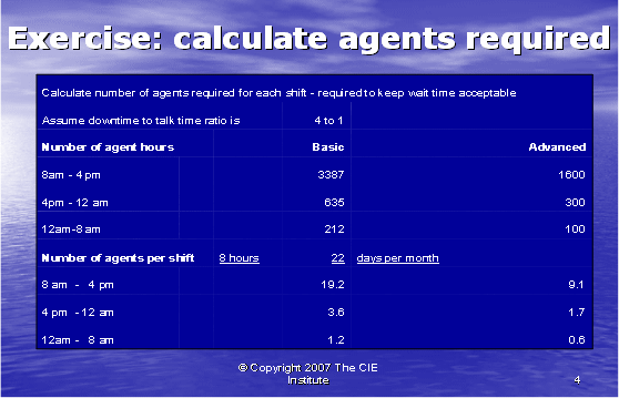 在我們計(jì)算出所需的座席數(shù)之前,我們必須了解一個(gè)座席的付薪工作時(shí)間和他的通話時(shí)長(zhǎng)的區(qū)別,通話時(shí)長(zhǎng)是座席真正花在電話上面對(duì)客戶的時(shí)間。一個(gè)座席不會(huì)一直處理電話,其它的時(shí)間用于培訓(xùn),休息,與主管獨(dú)處,部門會(huì)議,公司內(nèi)部為給客戶提供準(zhǔn)確的回答而進(jìn)行研究,對(duì)內(nèi)對(duì)外寫郵件,準(zhǔn)備下一個(gè)客戶的電話。在每個(gè)呼叫中心中,通話時(shí)長(zhǎng)和停工時(shí)長(zhǎng)的比率是不同的。對(duì)于復(fù)雜易變的產(chǎn)品,花在培訓(xùn)上的時(shí)間會(huì)更多。在新產(chǎn)品被頻繁介紹的呼叫中心,就需要更多的時(shí)間去研究關(guān)于新產(chǎn)品的回答。為了更精確,一個(gè)座席一周的工作時(shí)長(zhǎng)應(yīng)該與其通話時(shí)長(zhǎng)相比較,以便真正確定通話時(shí)長(zhǎng)與停工時(shí)長(zhǎng)的比率。在我們的例子中,我們假設(shè)停工時(shí)長(zhǎng)和通話時(shí)長(zhǎng)的比率為4:1,也就是說,每1小時(shí)通話時(shí)間,相對(duì)應(yīng)4小時(shí)停工時(shí)間。