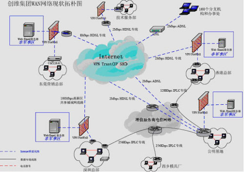 ·整個網(wǎng)絡(luò)連通性很差:隨著公司業(yè)務(wù)發(fā)展和規(guī)模擴大,現(xiàn)在整個集團除總部外還包括13個產(chǎn)業(yè)公司和全國160個分支機構(gòu),分布在以深圳為中心的全國各個地方,目前各產(chǎn)業(yè)公司之間的網(wǎng)絡(luò)連接除深圳總部、香港、公明基地和西鄉(xiāng)模具廠四地之間是通過窄帶IPLC專線連接外,其他各地均通過Internet公網(wǎng)連接,沒有構(gòu)成統(tǒng)一的企業(yè)內(nèi)部網(wǎng)絡(luò)互連。