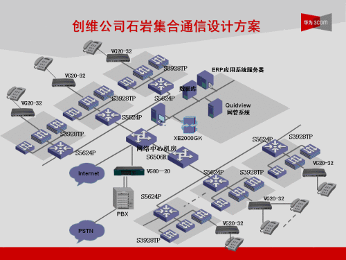 整個解決方案大量使用了華為3Com公司自主研發(fā)的XE2000、VG80-20、VG20-32、VG20-16、VG21-08等一系列VOIP系統(tǒng),整個石巖基地語音點數(shù)覆蓋1500點以上,未來發(fā)展可以擴展到2500點。
