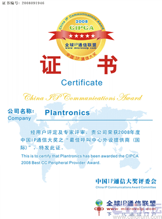 在近日結束的CIPCA2008年度中國IP通訊大獎評選中,繽特力(Plantronics) 榮獲“最佳呼叫中心外設提供商(國際類)”稱號。