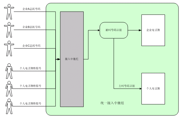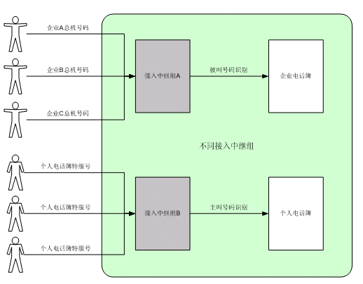企業(yè)電話簿呼叫中,系統(tǒng)將根據(jù)被叫號碼判別進(jìn)入相應(yīng)的企業(yè)電話簿,提供相應(yīng)的集團(tuán)總機(jī)服務(wù)。如需在同一組接入中繼中同時(shí)提供企業(yè)電話簿業(yè)務(wù)和個(gè)人電話簿業(yè)務(wù),則系統(tǒng)將首先進(jìn)行被叫號碼鑒別。若存在與被叫號碼相對應(yīng)的企業(yè)電話簿,則提供企業(yè)電話簿服務(wù);否則,進(jìn)行主叫號碼鑒別,判斷是否提供個(gè)人電話簿服務(wù)。