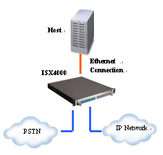 下圖顯示了一個小容量iSX4000 UAP系統(tǒng),該系統(tǒng)由一臺iSX4000 交換機和一臺主機服務(wù)器構(gòu)成,主機上運行所有的軟件,包括主控軟件、用戶應(yīng)用程序和 PRD 軟件。系統(tǒng)可同時提供最多1984 路PSTN端口和1920路VoIP端口的接入能力。