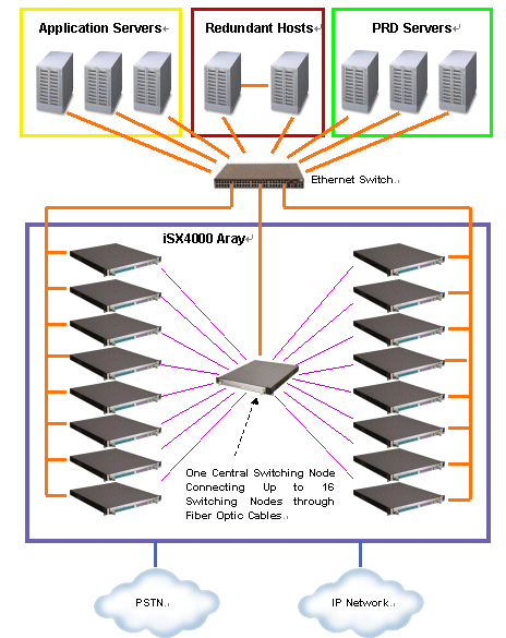下圖顯示了一個大容量iSX4000 UAP系統(tǒng),該系統(tǒng)由兩臺互為冗余備份的主機、三臺應(yīng)用服務(wù)器、三臺PRD服務(wù)器和一個由16臺iSX4000交換機和一臺中央交換節(jié)點構(gòu)成的iSX4000陣列構(gòu)成。交換陣列的16臺iSX4000交換機通過光纖和中央交換節(jié)點連接。中央交換節(jié)點提供系統(tǒng)跨節(jié)點交換能力。系統(tǒng)可同時提供最多31744 路PSTN端口和30720路VoIP端口的接入能力。