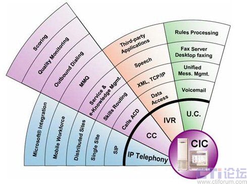 CIC平臺(tái)是一套符合呼叫中心營(yíng)運(yùn)所需,且有其營(yíng)運(yùn)所需模塊的All In One設(shè)備,如數(shù)字交換機(jī)、PABX、CTI、IVR、ACD、 Screen Pop、數(shù)據(jù)庫(kù)整合、網(wǎng)站整合服務(wù)(Web Call Back、Web Chat、VON、E-mail)、傳真服務(wù)器、傳真自動(dòng)回復(fù)、Dialer、Scripter、在線(xiàn)錄音...等所有功能,采用CIC平臺(tái)的系統(tǒng)比基于傳統(tǒng)PBX的系統(tǒng)更加易于維護(hù)。 CIC為企業(yè)體帶來(lái)一個(gè)功能齊備,技術(shù)人員及值機(jī)人員可以自己完全掌握的Call Center系統(tǒng),并且也是一個(gè)最上算投資報(bào)酬率ROI(Return Of Investment)的解決方案。
