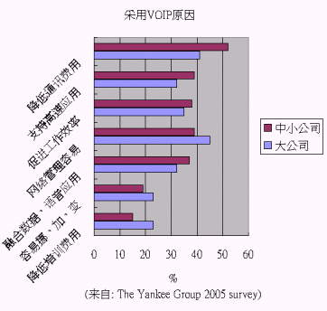 根據(jù)美國著名的咨詢公司 The Yankee Group 2005 年的調(diào)研各企業(yè)使用VOIP的原因,大企業(yè)與中小企業(yè)略有差異:大企業(yè)認為網(wǎng)絡(luò)管理、省錢、促進工作效率為最關(guān)鍵的三個原因;中小企業(yè)則認為省錢、網(wǎng)絡(luò)管理容易、支持高速應(yīng)用、促進工作效率為主要原因。