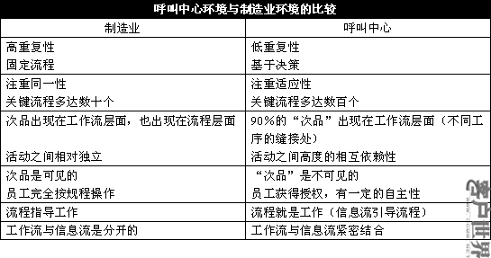 6西格瑪?shù)姆劢z們可能會說“呼叫中心的流程也是流程”(此話不假),而且“6西格瑪也是具有靈活性的”(把6西格瑪?shù)暮诵囊囟紥侀_之后也可以這么說)。那我們就來深究一下,為什么屬于變動環(huán)境的呼叫中心業(yè)務(wù)流程模式,與制造業(yè)的流程模式是完全不一樣的。