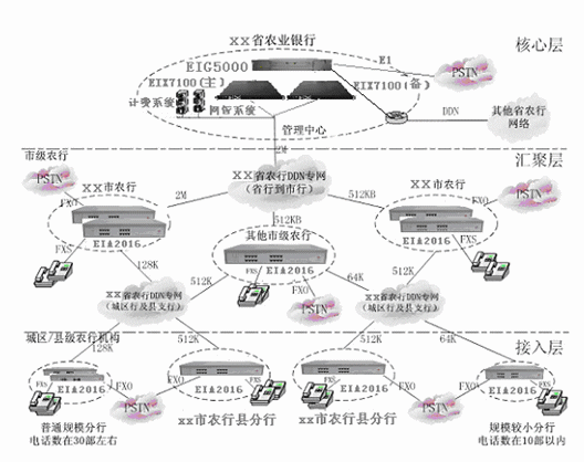 省行、各地市行與縣支行、分理處與數(shù)據(jù)業(yè)務(wù)共用專網(wǎng)線路,實(shí)現(xiàn)VOIP互連,形成一個(gè)全省范圍內(nèi)的VOIP大網(wǎng),實(shí)現(xiàn)全省內(nèi)部語音的免費(fèi)通信和內(nèi)部號碼的縮位拔號,節(jié)省了各行間的市話費(fèi)用,節(jié)省大量長途話費(fèi)。各節(jié)點(diǎn)按FXO:FXS