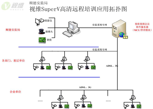 順德安監(jiān)局各部門及下屬單位使用安監(jiān)系統(tǒng)專網(wǎng)進行連接,而重點培育企業(yè)網(wǎng)絡(luò)情況復(fù)雜,涉及ADSL以及3G無線網(wǎng)絡(luò)等多種情況,視維根據(jù)順德安監(jiān)局、局下屬單位及重點培育企業(yè)的分布情況,將服務(wù)器架設(shè)在順德安監(jiān)局總部,并在總部搭建會議室和培訓(xùn)中心,其他各部門、下屬單位和重點培育企業(yè)為分會場。