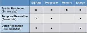 盡管移動(dòng)視頻設(shè)備的處理能力一代比一代強(qiáng)大,但用手持設(shè)備捕獲的HD或SD視頻全都需要處理,這樣才能被網(wǎng)絡(luò)服務(wù)器上的終端設(shè)備播放。表1給出了不同視頻編碼參數(shù)對(duì)解碼設(shè)備所需資源選擇的大致影響。該表專門對(duì)采用運(yùn)動(dòng)補(bǔ)償與離散余弦變換(DCT)技術(shù)實(shí)現(xiàn)視頻壓縮的基于塊的視頻編解碼器進(jìn)行了分析。