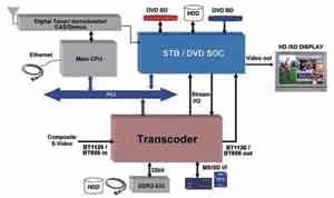 轉(zhuǎn)碼硬件必須與整個(gè)STB系統(tǒng)中的其他系統(tǒng)進(jìn)行良好交互,其中包括數(shù)字調(diào)諧器、解多路復(fù)用器 (Demuxer)和解調(diào)器、DDR2存儲(chǔ)器、PCI總線,以及向STB
