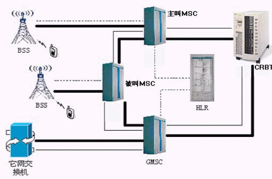 移動網(wǎng)絡(luò)CRBT解決方案主要由網(wǎng)關(guān)移動業(yè)務(wù)交換中心(GMSC),移動業(yè)務(wù)交換中心(MSC),歸屬位置寄存器(HLR),CRBT平臺等部分組成,其中需要使用GMSC實(shí)現(xiàn)與它網(wǎng)交換機(jī)進(jìn)行互聯(lián),網(wǎng)絡(luò)拓?fù)鋱D如下: