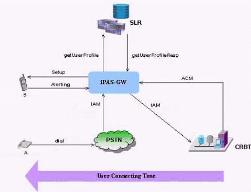 以UT斯達(dá)康的iPAS網(wǎng)絡(luò)為例進(jìn)行說明,被叫端局的iPAS-GW 可根據(jù)用戶的屬性決定用戶是否訂閱CRBT業(yè)務(wù),如果被叫用戶訂閱了該項(xiàng)業(yè)務(wù),則 iPAS-GW 將呼叫轉(zhuǎn)到CRBT平臺,由該平臺在被叫號碼前加撥特殊前綴后繼續(xù)向iPAS-GW發(fā)起新的呼叫,同時(shí)根據(jù)主叫號碼所選擇個(gè)性化鈴聲向主叫用戶放音,而iPAS-GW則直接接續(xù)被叫小靈通用戶,當(dāng)被叫用戶摘機(jī)后,CRBT平臺負(fù)責(zé)將主、被叫接通,也就是說在通話過程中始終要占用CRBT平臺的話路資源和 iPAS-GW 的中繼資源。如下圖所示: