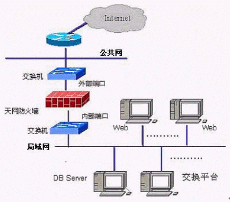 對整個(gè)系統(tǒng)網(wǎng)絡(luò)的保護(hù)首先要從保護(hù)內(nèi)部網(wǎng)絡(luò)避免受到Internet網(wǎng)上的攻擊為主,可以采用高可靠性的防火墻作為主要手段,網(wǎng)絡(luò)拓?fù)鋱D如下圖所示:
