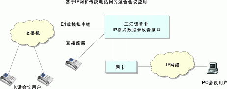 交互式電話會議與傳統(tǒng)的電話會議的區(qū)別就在于開會時不需要由會議主持人控制由某人發(fā)言,而是所有與會者可以自由發(fā)言,就如同坐在同一間會議室中一樣。三匯公司所有型號的基于DSP技術(shù)的語音卡,包括數(shù)字卡和模擬卡,均內(nèi)置了對交互式電話會議的支持,只要使用語音卡,無需額外的會議卡,就可以構(gòu)成具有完善功能的交互式電話會議系統(tǒng)。三匯公司還采用了獨(dú)創(chuàng)的分布式電話會議實現(xiàn)技術(shù),電話會議的關(guān)鍵資源----混音器分布在每一個通道中。因此語音卡對會議系統(tǒng)的支持具有極大的靈活性,既可以召開大量的三方會議,也可召開所有通道同時參加的大型會議,無論是會議的數(shù)量還是參加會議的人數(shù)均只受系統(tǒng)總通道數(shù)的限制。三匯語音卡還支持IP會議和傳統(tǒng)電話會議的混合應(yīng)用。
