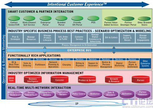其次,CES改變了現(xiàn)有的業(yè)務(wù)應(yīng)用層將功能和流程融合在一起的模式,對流程和功能進(jìn)行了分離。實際上,應(yīng)用功能和流程結(jié)合得越緊密,系統(tǒng)的適應(yīng)性就會越差,對新業(yè)務(wù)和新產(chǎn)品的響應(yīng)時間就越長,CES將業(yè)務(wù)應(yīng)用層分為流程層和應(yīng)用功能層,流程和功能的分離極大的提高了系統(tǒng)靈活性,降低了系統(tǒng)集成的復(fù)雜程度和成本開銷,滿足了新業(yè)務(wù)和新產(chǎn)品快速上市的要求。在流程層,運營商不僅可以選擇采用Amdocs在25年服務(wù)經(jīng)驗的基礎(chǔ)上總結(jié)的業(yè)界最佳實踐的業(yè)務(wù)流程,也可以選擇采用企業(yè)現(xiàn)有的業(yè)務(wù)流程;在應(yīng)用功能層,Amdocs全系列軟件產(chǎn)品將更加模塊化,運營商可以選擇Amdocs全系列軟件產(chǎn)品,也可以選擇其中的個別或部分產(chǎn)品,這種高度模塊化的產(chǎn)品將以更快的速度集成到運營商已有的IT框架中。
